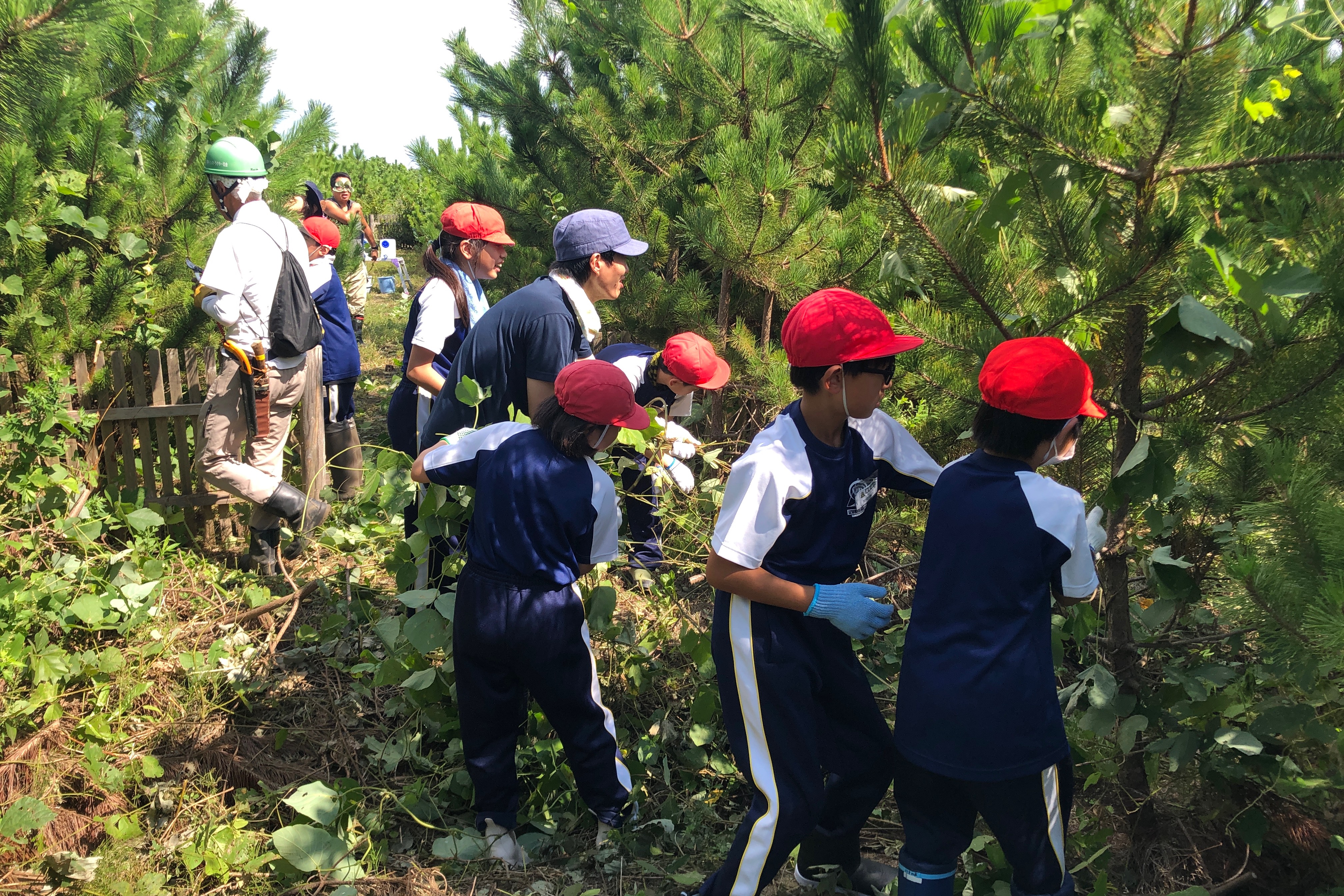 令和7年9月17日(水)、仙台市若林区荒浜北官林(第2号区)において、『「岩沼・荒浜潮除須賀松の森」保育事業』として「次代を担う子どもたちの海岸防災林保育活動」が開催されました。NPO法人宮城県森林インストラクター協会の全面的な協力をいただき、仙台市立泉松陵小学校5年生56名、引率の先生3名及び森林インストラクター協会のスタッフなど、合わせて83名で保育活動を行いました。開会式では注意事項、海岸防災林の機能や保育の重要性などの説明の後、児童は8班編成で4班ずつ2組に分かれ、防災林内のクズの抜き取りと除草作業を行いました。そのほか、ビーチコーミング(マイクロプラスチックごみ採取)や釣りなどの活動を行い大変満足されていました。参加された皆さん、大変お疲れ様でした。なお、この活動は、10月に開催される第48回全国植樹祭の記念行事として実施しました。