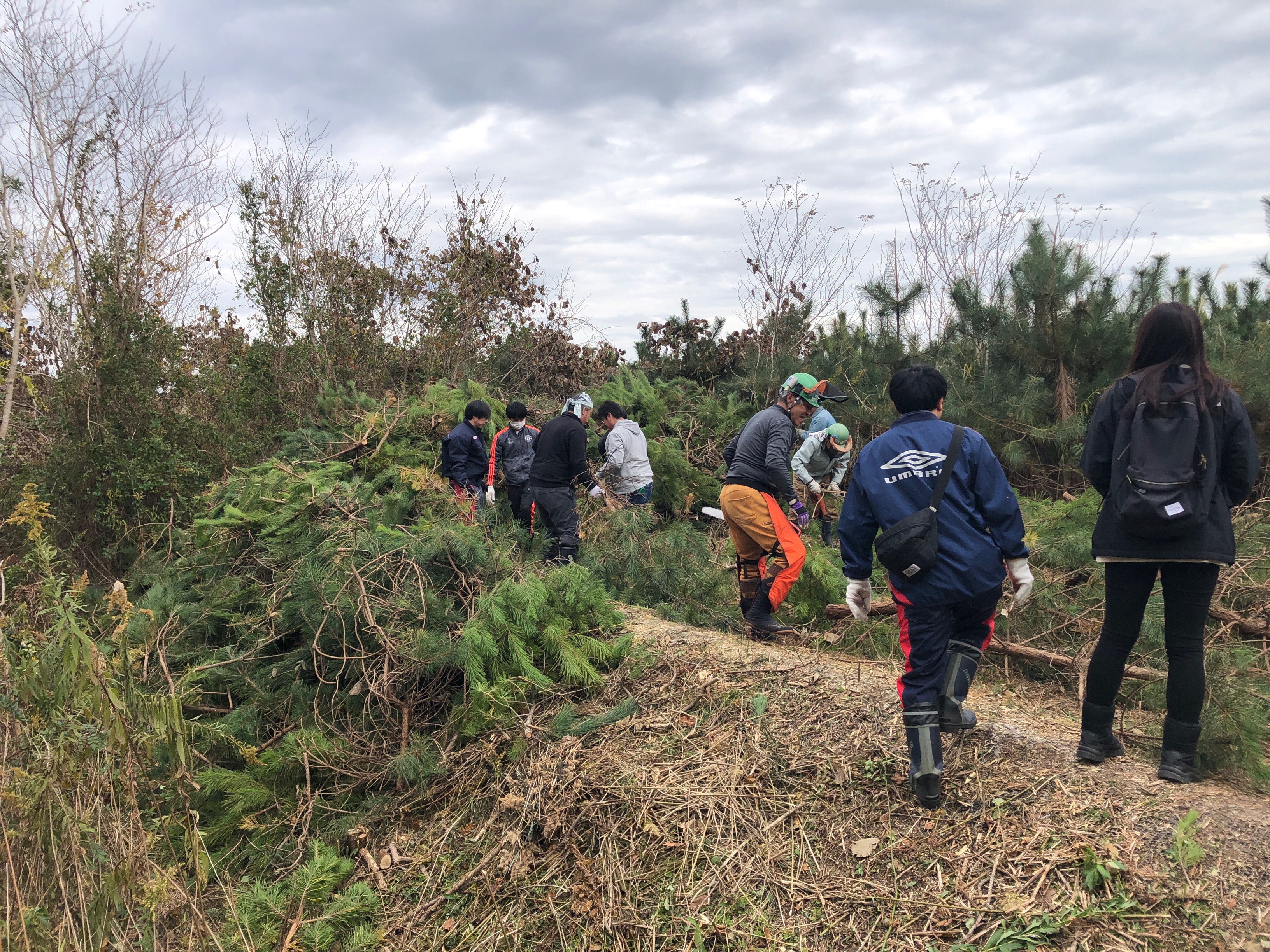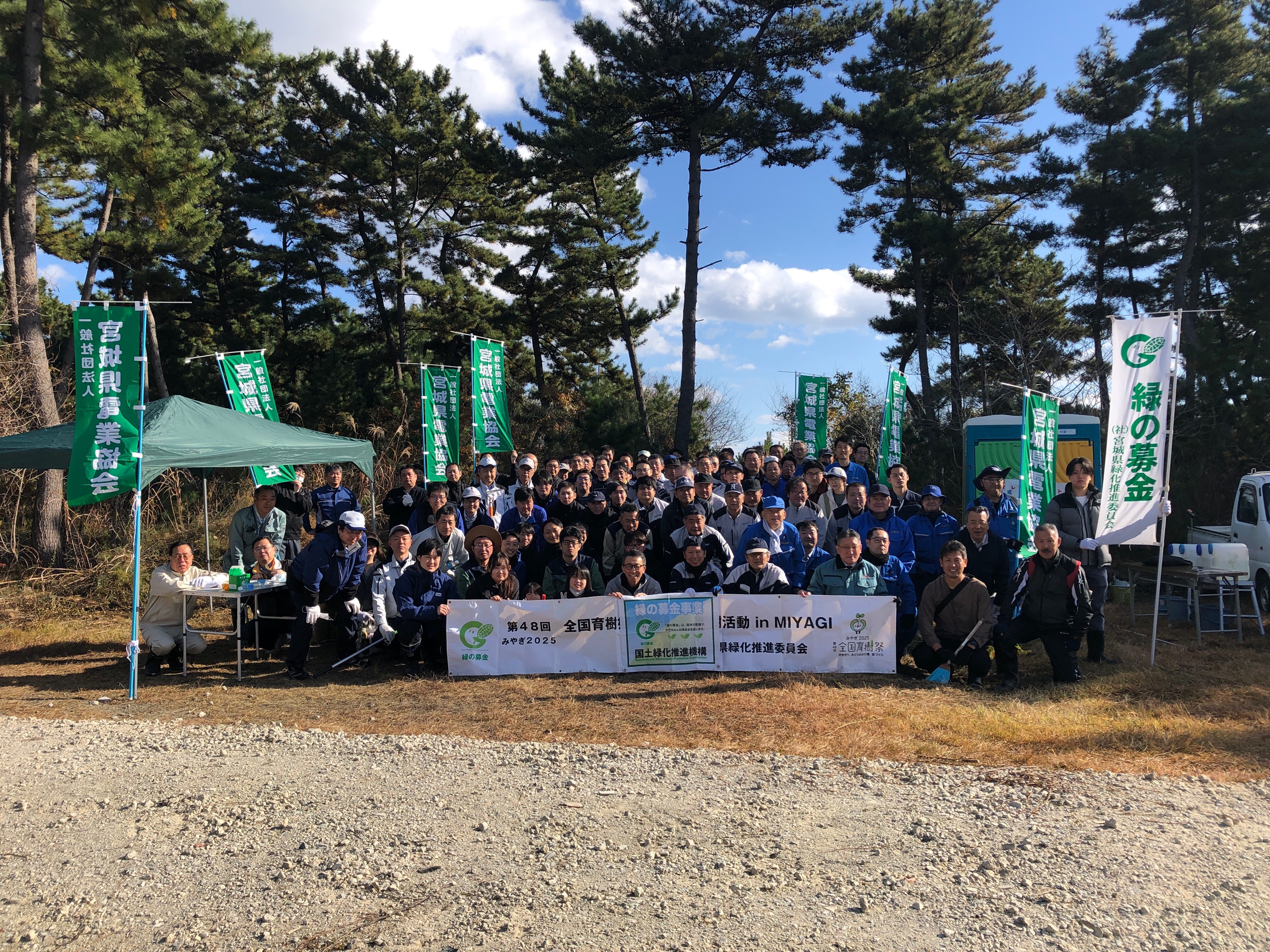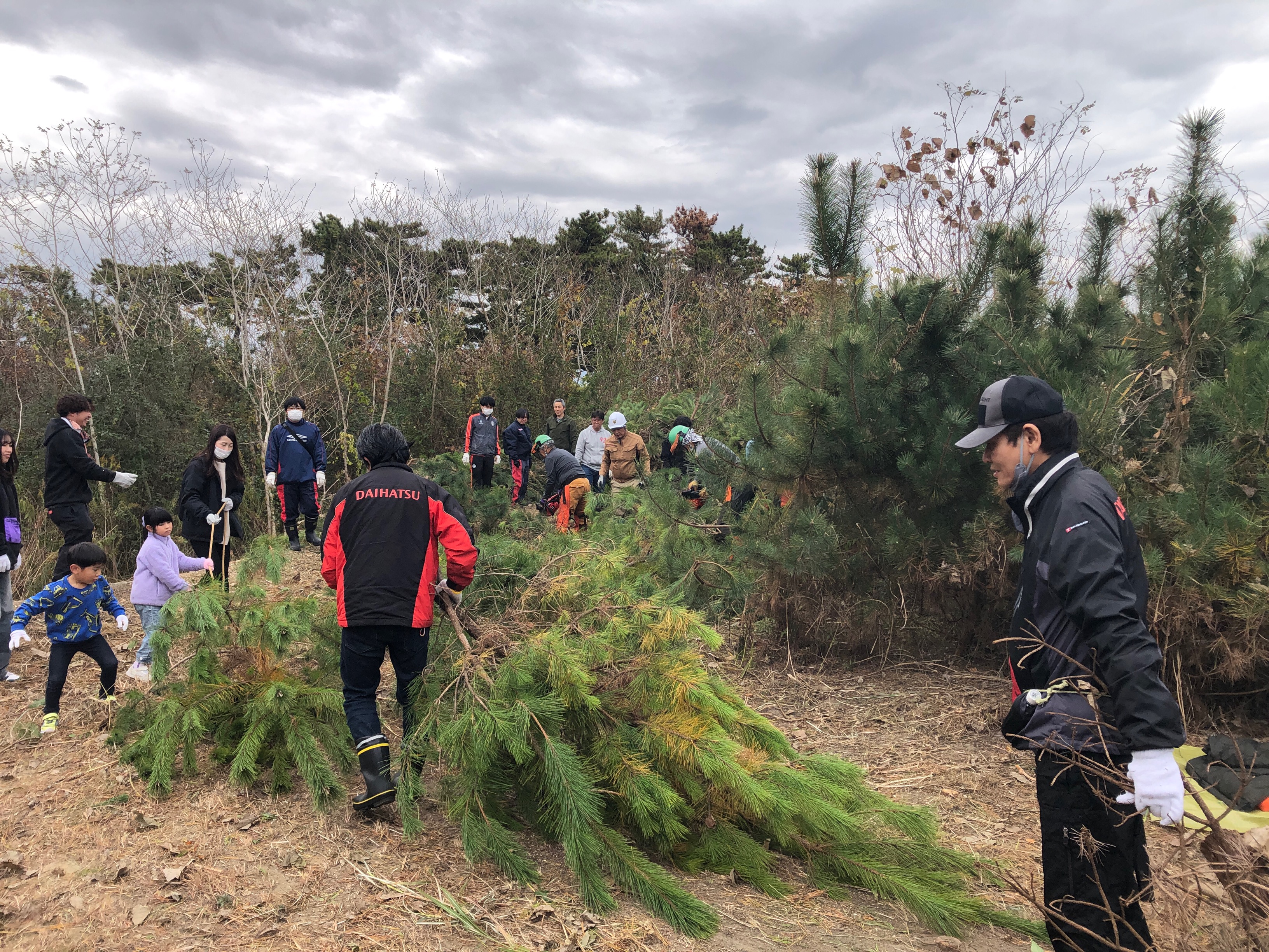令和7年11月24日(月)、岩沼市寺島川向地区において『「岩沼・荒浜潮除須賀松の森」保育事業』として、「次代へつなげよう!企業協働による海岸防災林保育活動」が開催されました。NPO法人宮城県森林インストラクター協会の全面的な協力をいただき、宮城ダイハツ販売(株)の役員・社員のみなさん159名と、インストラクター協会のスタッフ合わせて190名で保育活動を行いました。開会式では、作業の注意事項、緑の募金への協力に対するお礼のほか、全国育樹祭のポストイベントとして実施していることの説明がありました。保育活動は12班に分かれて行い、効率よく本数調整伐、枝打ち作業が行われ、好天に恵まれ怪我なく無事作業を終了することができました。参加された皆さん大変お疲れ様でした。
