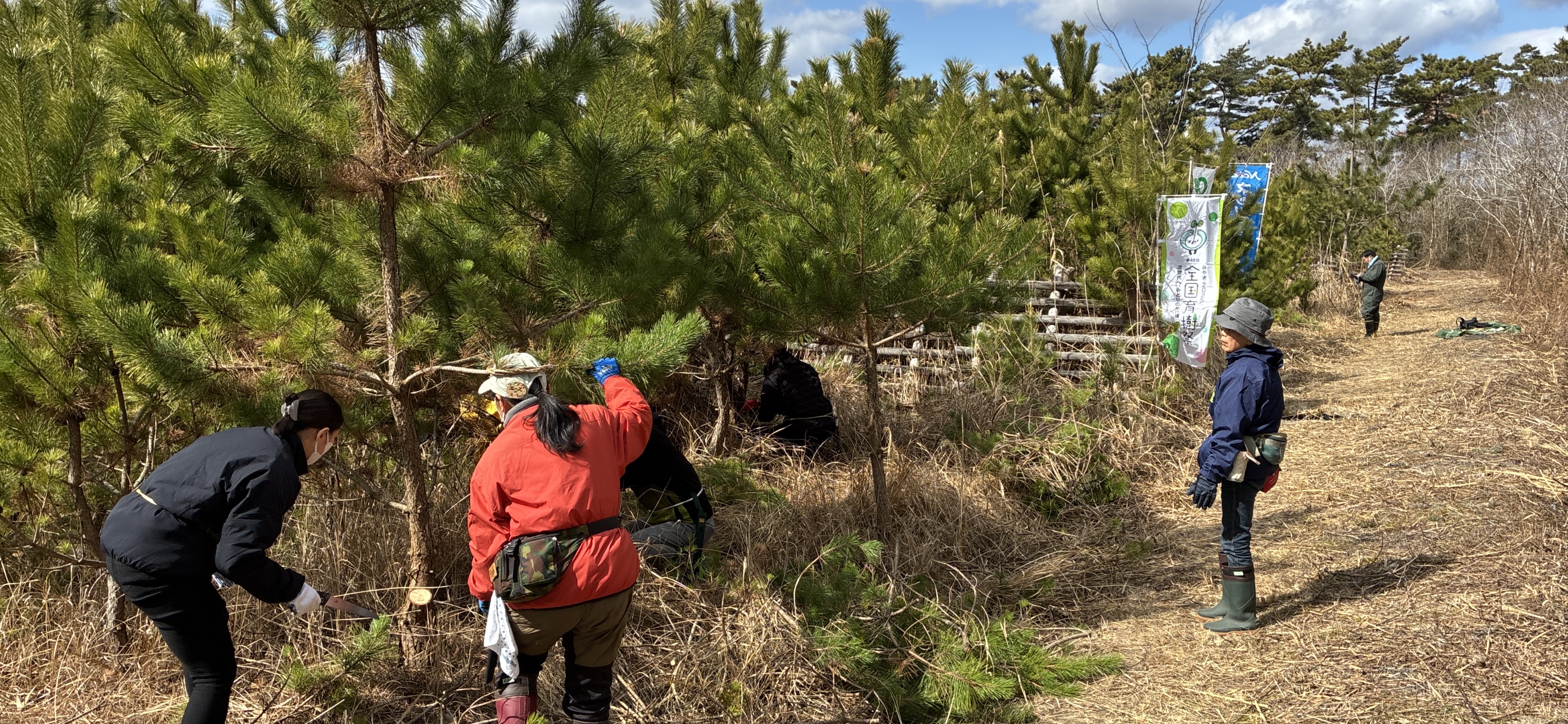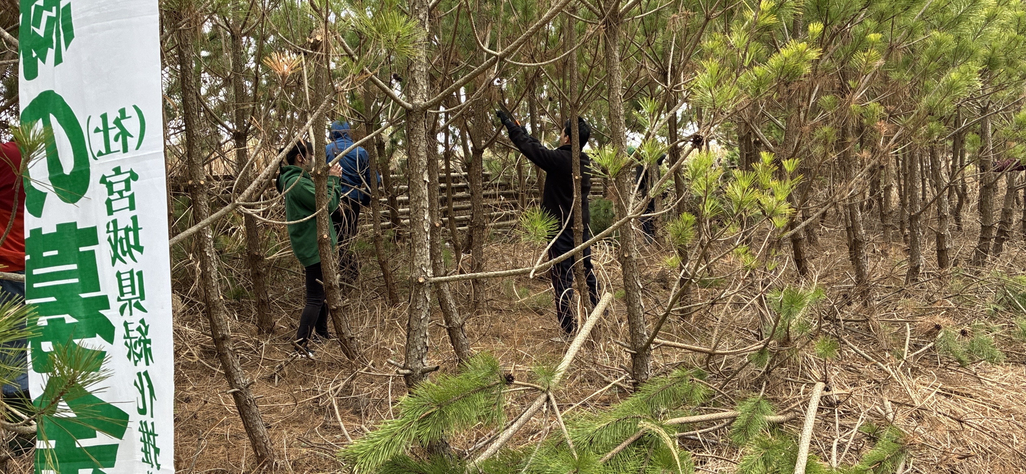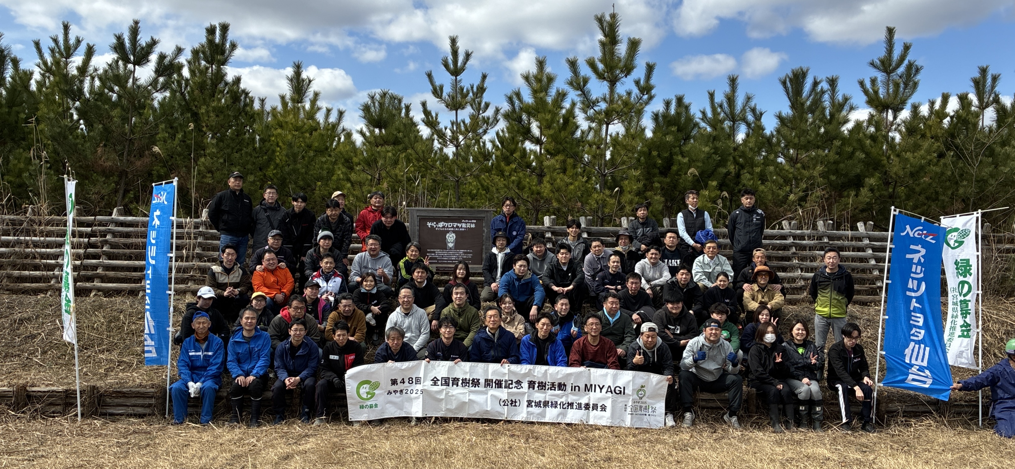 令和8年3月9日(月)、岩沼市寺島川向地区において「第48回全国育樹祭」開催記念事業として、「企業協働による海岸防災林保育活動」が開催されました。NPO法人宮城県森林インストラクター協会の全面的な協力をいただき、ネッツトヨタ仙台(株)の役員・社員のみなさん75名と、インストラクター協会のスタッフ合わせて109名で保育活動を行いました。開会式では、作業の注意事項、緑の募金への協力に対するお礼のほか、全国育樹祭のポストイベントとして実施していることの説明がありました。保育活動は9班に分かれて効率よく枝打ち作業が行われ、好天にも恵まれ怪我なく無事作業を終了することができました。参加された皆さん大変お疲れ様でした。