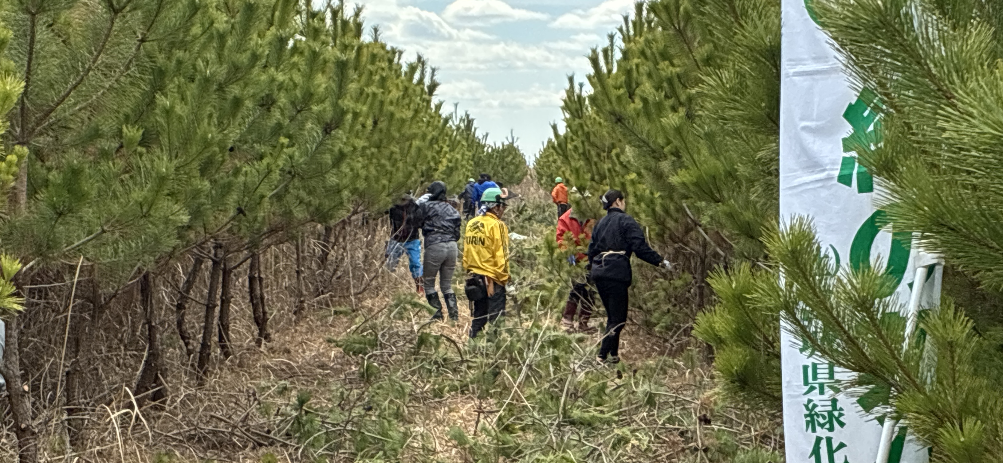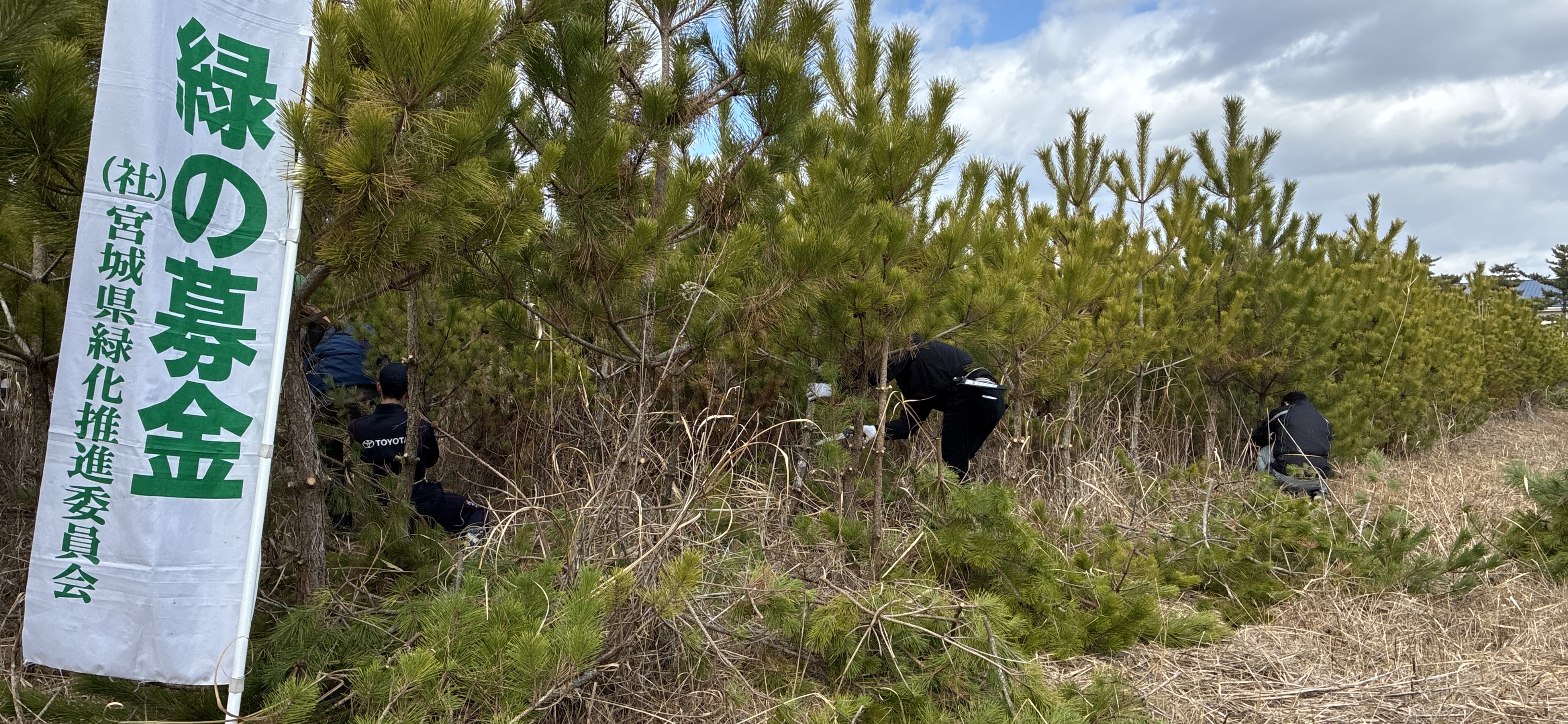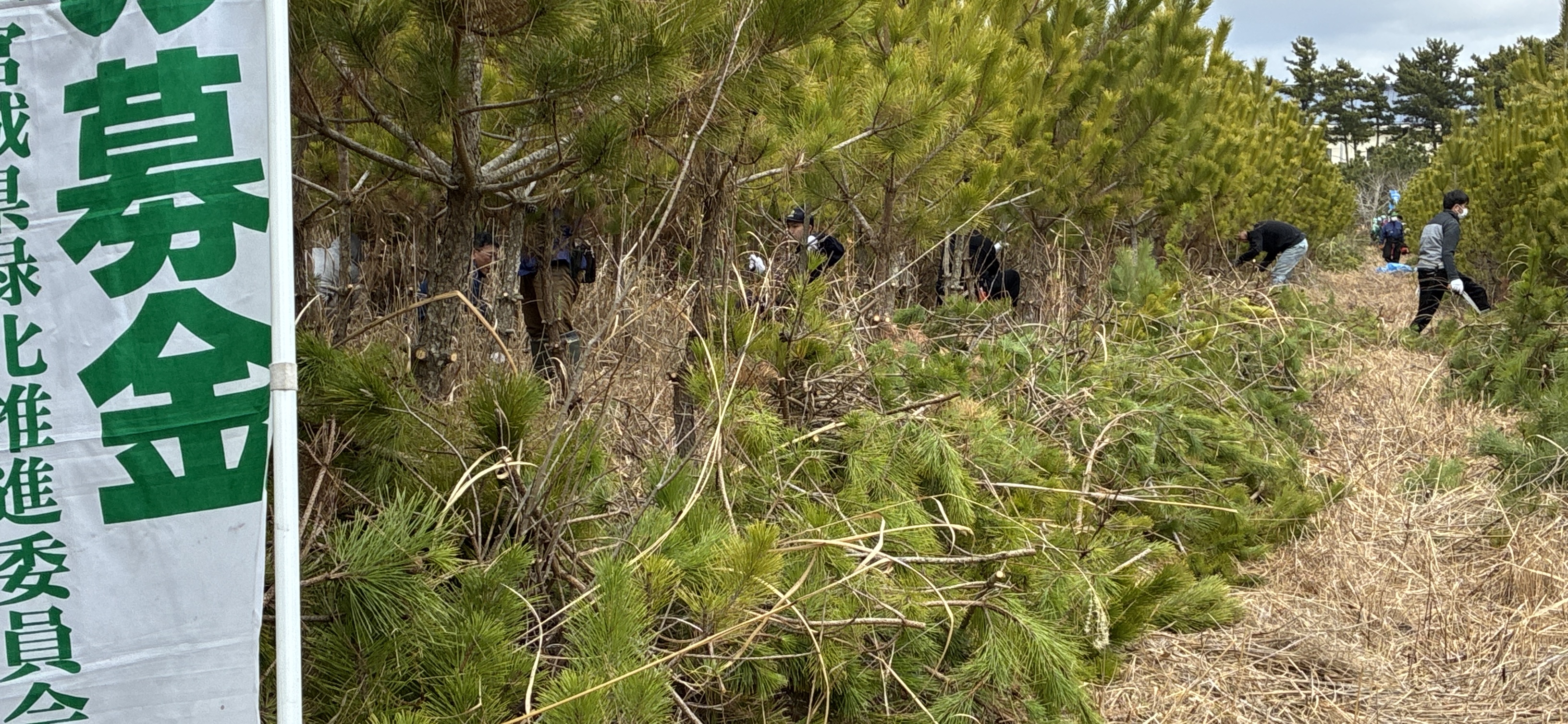 令和8年3月9日(月)、岩沼市寺島川向地区において「第48回全国育樹祭」開催記念事業として、「企業協働による海岸防災林保育活動」が開催されました。NPO法人宮城県森林インストラクター協会の全面的な協力をいただき、ネッツトヨタ仙台(株)の役員・社員のみなさん75名と、インストラクター協会のスタッフ合わせて109名で保育活動を行いました。開会式では、作業の注意事項、緑の募金への協力に対するお礼のほか、全国育樹祭のポストイベントとして実施していることの説明がありました。保育活動は9班に分かれて効率よく枝打ち作業が行われ、好天にも恵まれ怪我なく無事作業を終了することができました。参加された皆さん大変お疲れ様でした。